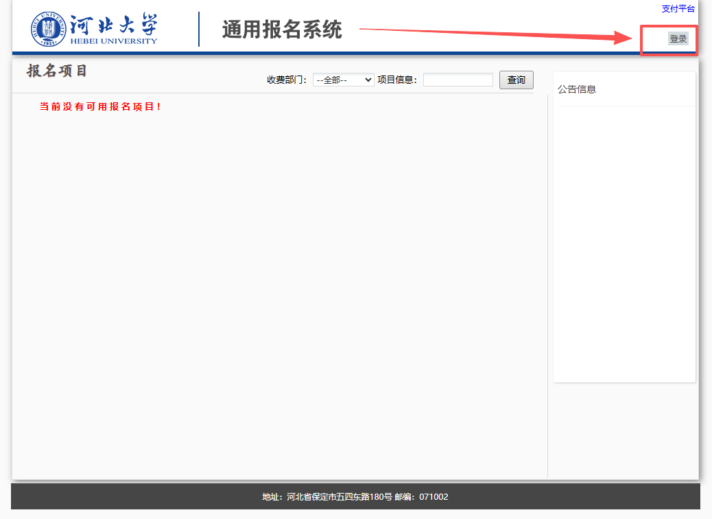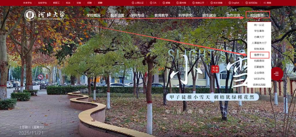 (一)登陆河北大学主页(http://www.hbu.edu.cn/),点击右上方“校园服务—缴费平台”